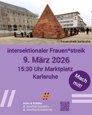 am 9. März findet in Karlsruhe ab 15:30 Uhr (bis 18:00 Uhr) der Intersektionale Frauen*streik statt, organisiert vom Töchterkollektiv. An diesem Frauenstreik werden sich Frauen und Unterstützerinnen und Unterstützer in über 100 Städten in Deutschland beteiligen.